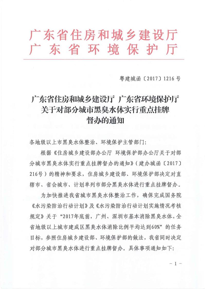 广东省住房和城乡建设厅 广东省环境保护厅关于对部分城市黑臭水体实行重点挂牌督办的通知- 新澳彩资料-新澳门六合彩资料