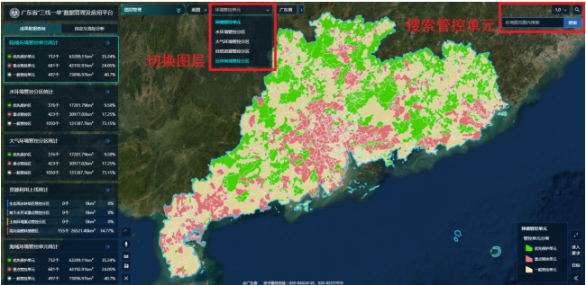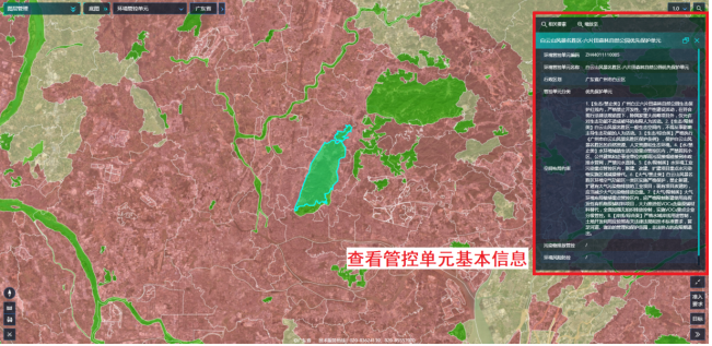 在广东省地图上查看环境管控单元分布,通过切换图层查看水环境、大气环境、自然资源、近岸海域等不同管控分区分布。在地图上点击管控单元或者在地图右上角搜索框搜索管控单元名称,查看相应管控单元所在位置、类型、相关管控要求等基本信息。