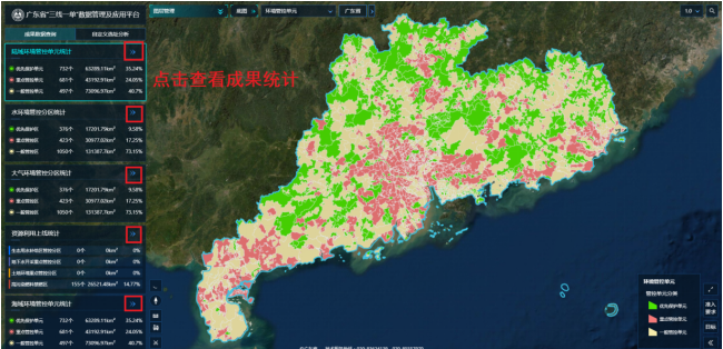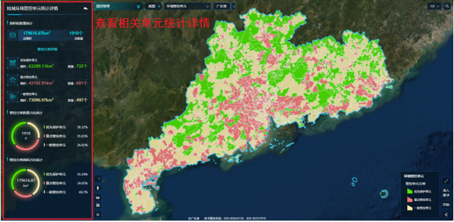 左侧统计信息栏中可查看环境管控单元数量、面积及其占比等统计信息,点击详情按钮可进一步查看统计详情。