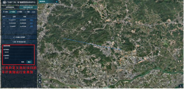通过在地图上点选、线选、面选,或者上传坐标数据文件,或者手动输入经纬度,并可选择环评类别或者行业类别进行模拟项目选址,识别选址涉及的环境管控单元,智能分析与相关管控要求的符合性,为项目选址可行性提供参考。