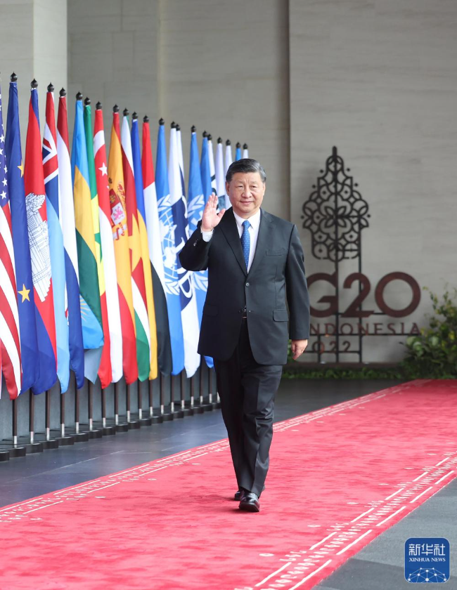 当地时间11月15日,二十国集团领导人第十七次峰会在印度尼西亚巴厘岛举行。国家主席习近平出席并发表题为《共迎时代挑战 共建美好未来》的重要讲话。这是习近平步入会场。新华社记者 鞠鹏 摄