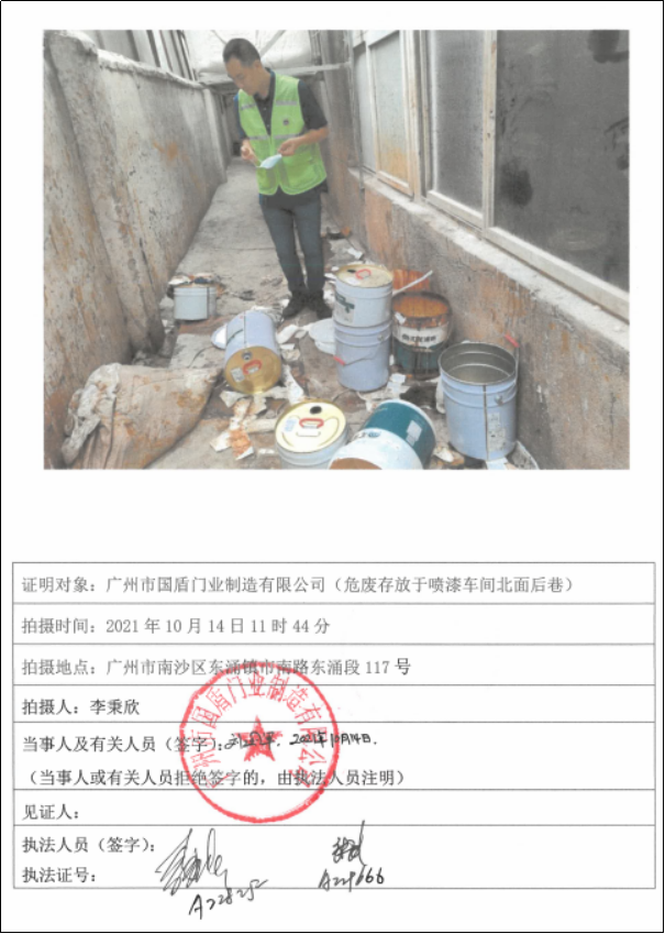广州市国盾门业制造有限公司在广州市南沙区东涌镇市南路东涌段117号经营防火门生产项目。2021年10月14日,存在未按照国家环境保护标准贮存危险废物的违法行为,具体如下:喷漆车间北面后巷混合堆放15个废有机溶剂包装桶和废胶纸,总重量约27.2公斤,且该贮存场所无防渗漏等防护措施,不符合危险废物贮存标准。