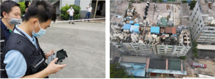 5月31日,宝安某线路板厂一生产车间楼顶发生火情,由于现场已拉起警戒线封闭,无法深入现场查看环境污染情况,执法人员立即启动便携式无人机对事故现场进行航拍调查,高空巡检楼顶废气处理设施的受损情况、消防人员的灭火进展及消防废水的去向,研判分析消防废水走向,指导企业对雨水总排口进行封堵抽排,将厂区内所有消防废水抽排至应急池紧急处理。同时,组织环境监测人员对雨水总排口收集的废水进行采样送检,并结合风向和着火区域点位对现场进行废气布点检测,及时掌握污染物浓度及扩散情况,及时消除隐患,避免造成二次污染。