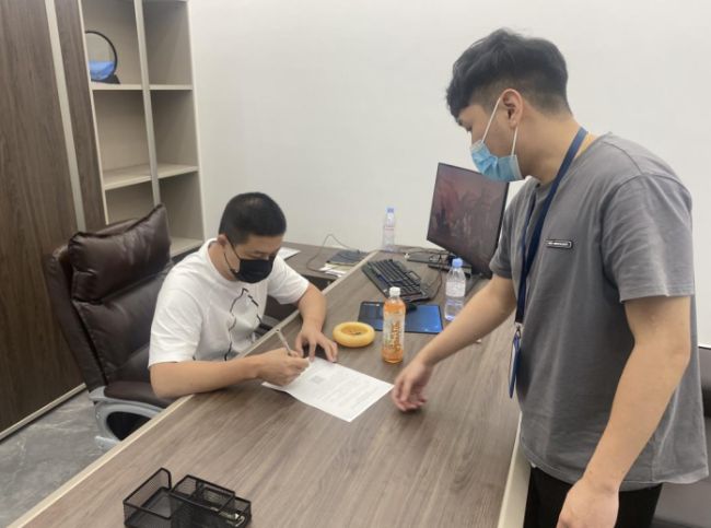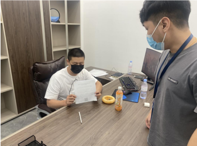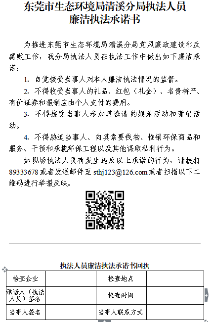 廉洁执法承诺书制度,是指通过分局自制的《东莞市生态环境局清溪分局执法人员廉洁执法承诺书》,实现“线上+线下+回访”的闭环监督反馈。一是线下派发承诺书。执法人员每到一家企业进行检查调查,需要将《廉洁执法承诺书》交给企业负责人填写,企业签名后将回执交还执法人员。二是电话回访跟踪。执法人员将回执统一交至综合股,综合股进行数据统计和电话回访;三是线上匿名反馈。每份《廉洁执法承诺书》上印有二维码,企业通过扫码进行线上匿名投诉,消除企业顾虑。据统计,2021年至今,清溪分局共发放及回收廉洁执法承诺书近2000张,未出现过一起执法廉洁问题。