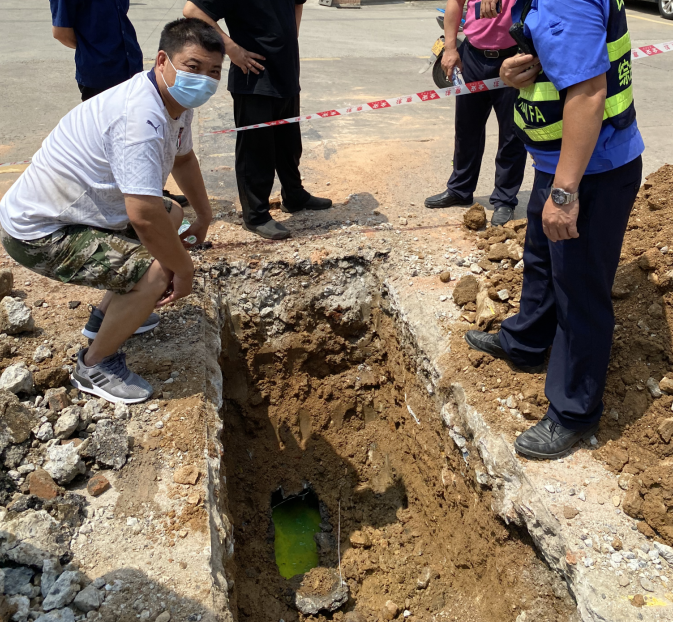 2022年4月25日9时00分,民众执法局联合公安机关委托施工单位对该司门口东北方位厂区外道路下水道走向进行开挖,发现原干化池旁PVC管道通过厂内下水道经退火车间西南角的下水道流向该司正门口厂区外东北方位道路下水道。