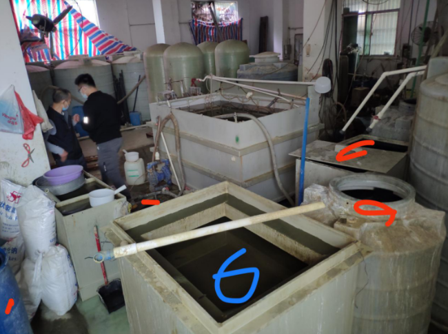 车间现场图片(标红为酸性桶,蓝色为碱性桶)