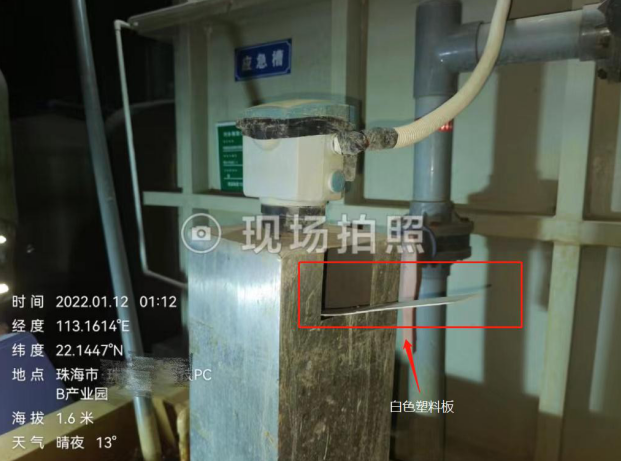 2022年1月12日凌晨,珠海市生态环境局富山分局通过自动监测大数据分析发现某线路板公司存在作假嫌疑,执法人员根据掌握的线索对位于珠海市斗门区的线路板公司开展夜间突击检查。检查中发现,该公司废水排放口设置的在线监控超声波明渠流量计被人为放置了一块白色塑料板,对排放废水的流量计量造成干扰。在现场,执法人员发现超声波明渠流量计表显示的瞬时流量于2022年1月12日1:05分到3:57分长期无变化,数值为13.214 L/S,而在超声波明渠流量计探头处的白色塑料遮挡板被取走后,超声波明渠流量计表显示的瞬时流量随即发生变化。