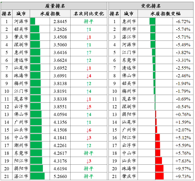 城市排名:基于270个省考断面水质监测结果,按照城市水质指数由低到高排名,全省水环境质量前三名为河源、韶关和肇庆市,后三名由高到低为湛江、揭阳和阳江市。惠州、潮州和湛江等12市水环境质量同比有所改善,肇庆、珠海和汕头等9市同比有所下降。