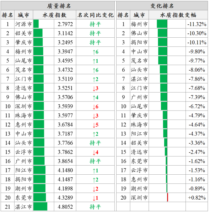 城市排名:基于270个省考断面水质监测结果,按照城市水质指数由低到高排名,全省水环境质量前三名为河源、韶关和肇庆市,后三名由高到低为湛江、东莞和潮州市。梅州、佛山和揭阳等19市水环境质量同比有所改善,深圳市同比有所下降(河源市所有省考断面均达到水质目标且均达到或优于Ⅱ类,不参与水质变化排名)。