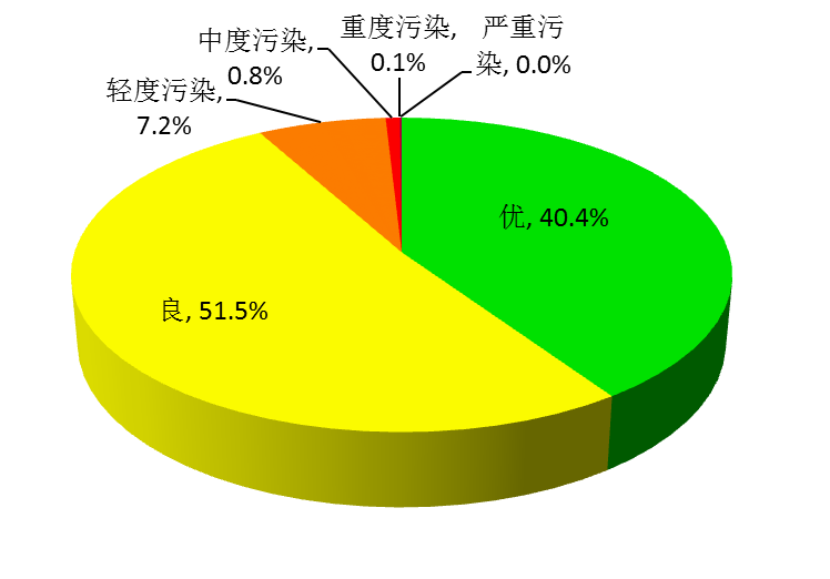 2015年第四季度全省各城市空气质量达到二级以上天数比例平均为91.9% ,其中,优占40.4%,良占51.5%;超标天数比例为8.1%,其中轻度污染占7.2%,中度污染占0.8%,重度污染占0.1%,无严重污染。