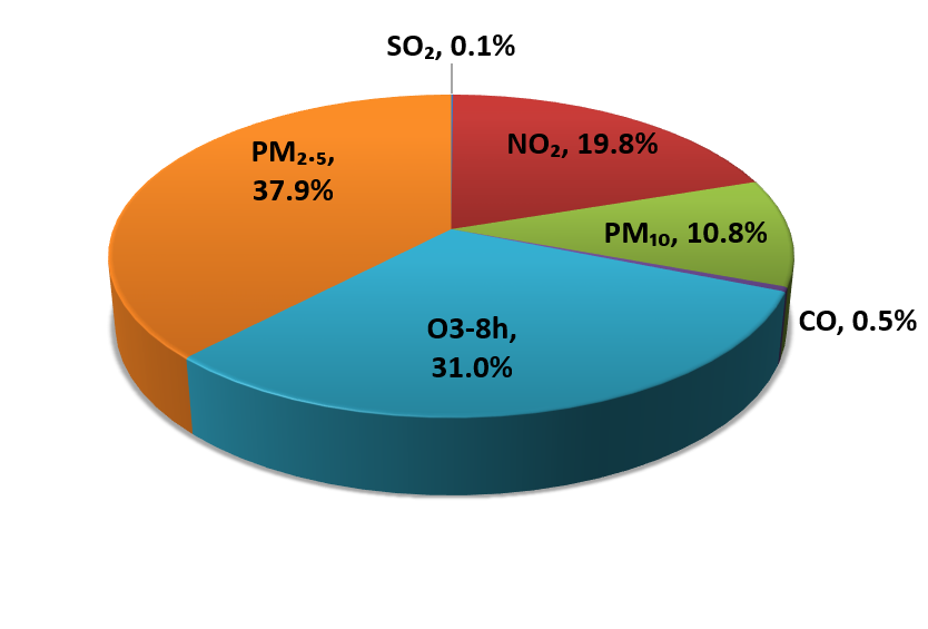 3、环境空气综合质量指数是描述城市环境空气质量综合状况的无量纲指数,它综合考虑了SO2NO2PM10PM2.5COO3 等六项污染物的污染情况,环境空气综合质量指数越大表明综合污染程度越重。城市月度和季度评价的环境空气综合质量指数计算方法如下:
