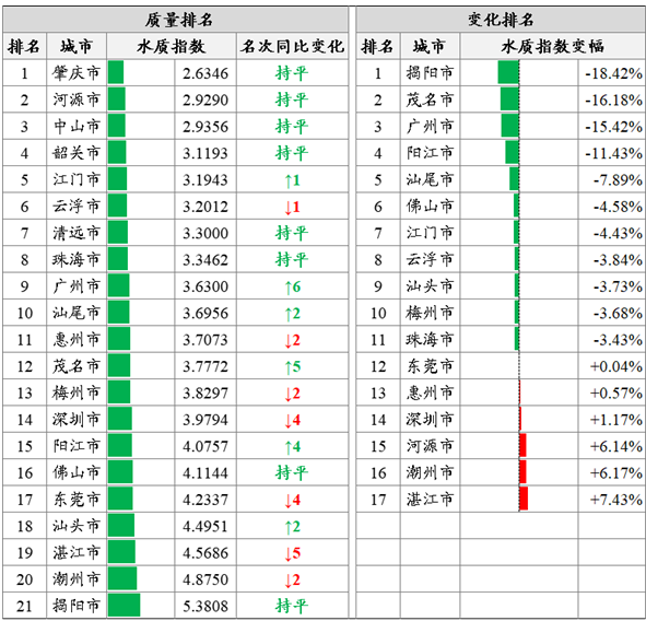 2.水质指数变幅为水质指数同比,“-”表示改善,“+”表示变差。
