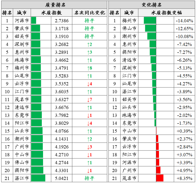 城市排名:基于270个省考断面水质监测结果,按照城市水质指数由低到高排名,全省水环境质量前三名为河源、肇庆和韶关市,后三名由高到低为湛江、揭阳和佛山市。梅州、佛山和潮州等14市水环境质量同比有所改善,茂名、广州和河源等7市同比有所下降。