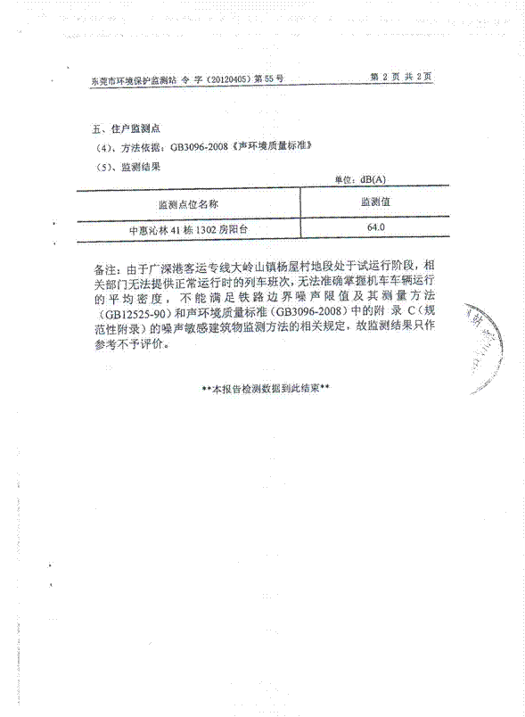 自去年9月以来,我厅环境监察局执法人员多次会同东莞市环保局环境监察分局、东莞市环境监测站以及中惠沁林山庄物管人员进行了现场检查。经现场勘察,发现大岭山镇杨屋村中惠沁林山庄地处广深港客运专线DK65000DK68000段,线路距山庄围墙67.9m,该路段沿线未建有任何隔音降噪设施,受其影响主要为山庄的3943栋,共500户住户(目前实际入住300余户)。根据铁道科学研究院编制的《新建铁路广深港客运专线广州至深圳段环境影响报告书》,广深港客运专线广州至深圳段项目于20051月完成环境影响评价现场踏勘,当时中惠沁林山庄未建设(该山庄于200510月经东莞市环保局批复建设)。根据东莞市环境保护监测站出具的监测报告,动车组通过时距铁路边界30米处的1号监测点监测值为62.3分贝、山庄411302室阳台的2号监测点为64分贝,现场监测时动车车流密度约5辆次/小时,动车经过该路段时间约5秒(详见附件)。