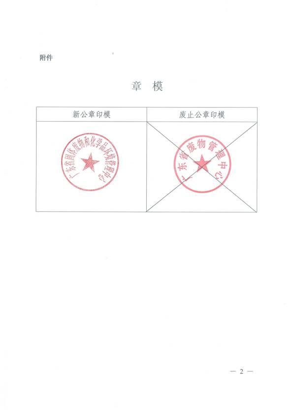 根据《广东省机构编制委员会办公室关于广东省废物管理中心更名等问题的函》(粤机编办发〔2014〕182号),我厅直属机构“广东省废物管理中心”更名为“广东省固体废物和化学品环境管理中心”(简称“广东省固管中心”),自2015年3月1日起启用“广东省固体废物和化学品环境管理中心”印章,原“广东省废物管理中心”印章同时废止。
