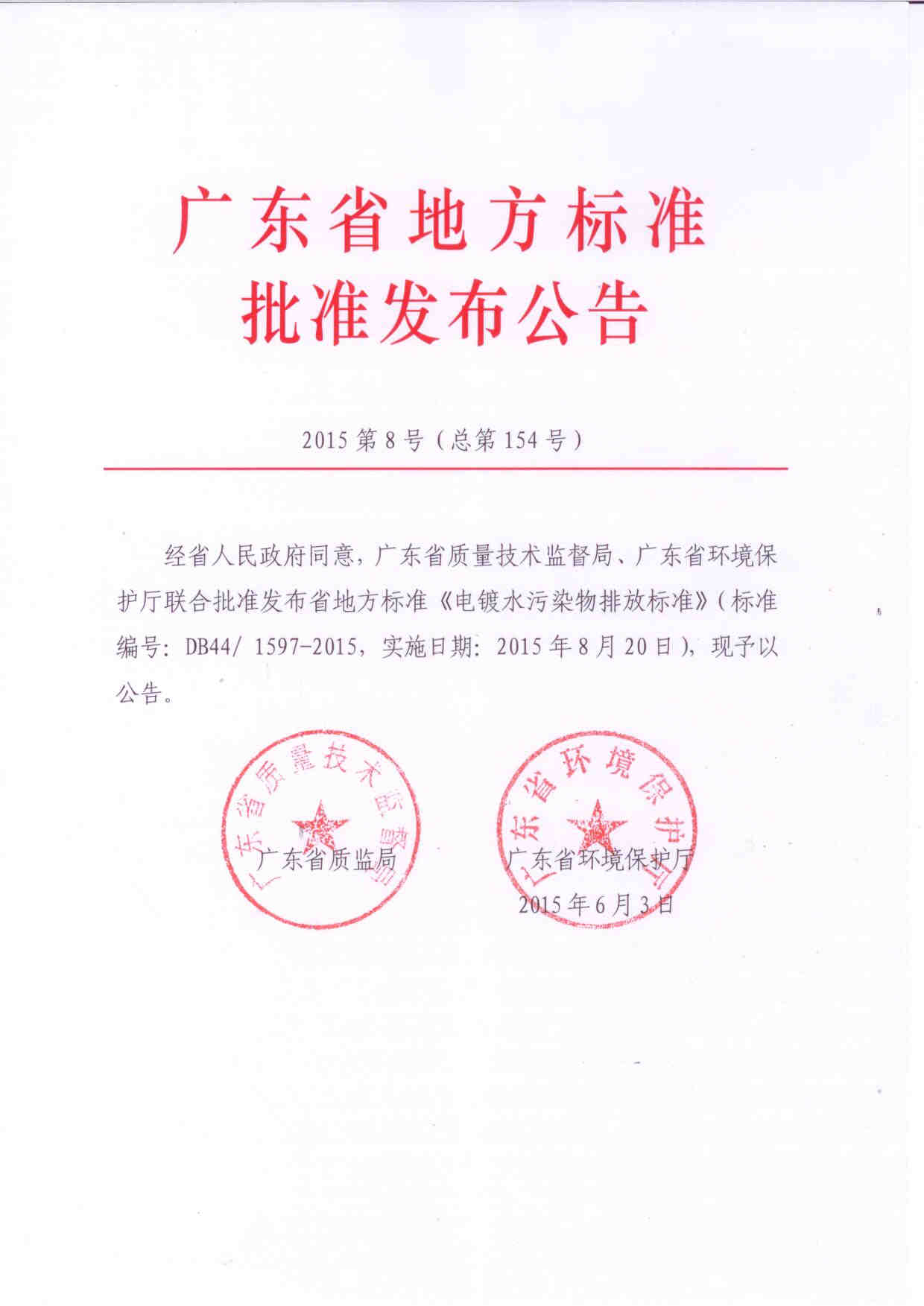 经省人民政府同意,广东省地方环境标准《电镀水污染物排放标准》(DB 44/1597-2015)已由省质监局会同我厅联合发布(见附件),该标准定于2015年8月20日起实施。请各地加强宣传培训,认真组织学习,严格监督检查,督促相关企业提标改造,切实做到污染物达标排放。在标准实施过程中遇到的问题,请径向我厅反映。
