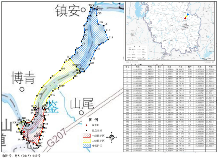 | 二级 保护区 | 水域 | \ | \ | 一级保护区水域上边界往上2005.00 m,与石湾街道饮用水水源二级保护区水域下边界衔接,以及一级保护区水域下边界至下游200.00 m,堆金河支流汇入口(E110°34′19.956″,N21°41′51.792″)往上1000.00 m,多年平均水位对应的高程线下的水域。 | 2.34 |