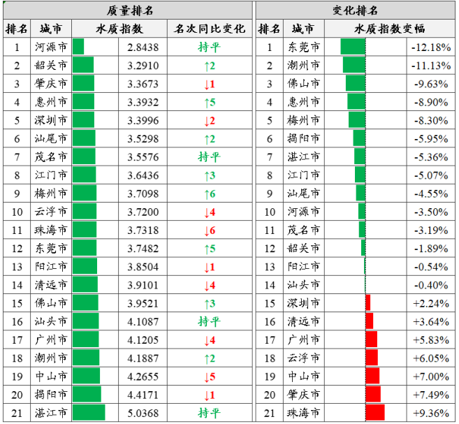 城市排名:基于270个省考断面水质监测结果,按照城市水质指数由低到高排名,全省水环境质量前三名为河源、韶关和肇庆市,后三名由高到低为湛江、揭阳和中山市。东莞、潮州和佛山等14市水环境质量同比有所改善,珠海、肇庆和中山等7市同比有所下降。