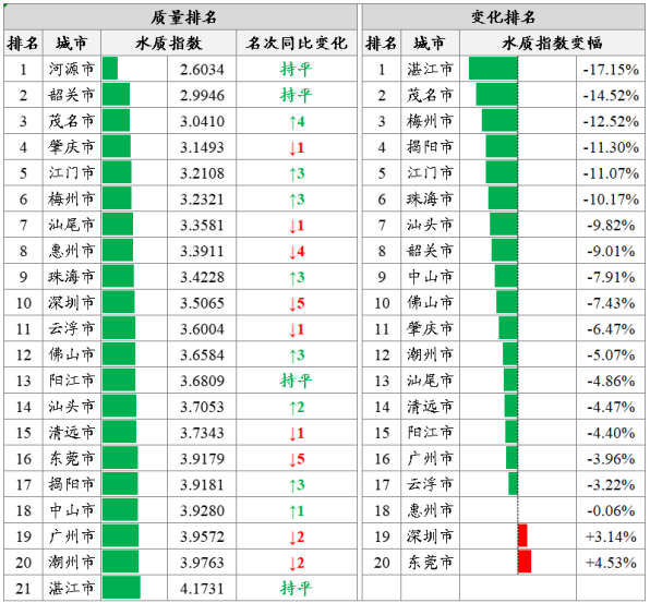 城市排名:1-3月,基于270个省考断面水质监测结果,按照城市水质指数由低到高排名,全省水环境质量前三名为河源、韶关和茂名市,后三名由高到低为湛江、潮州和广州市。湛江、茂名和梅州等18市水环境质量同比有所改善,东莞和深圳2市同比有所下降(河源市所有省考断面均达到水质目标且均达到或优于Ⅱ类,不参与水质变化排名)。