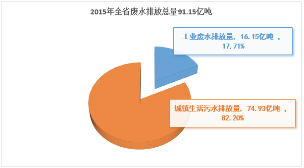 废水排放量 2015年全省废水排放总量91.15亿吨,较上年增长0.71%。其中工业废水排放量16.15亿吨,占废水排放总量的17.71%;城镇生活污水排放量74.93亿吨,占废水排放总量的82.20%。