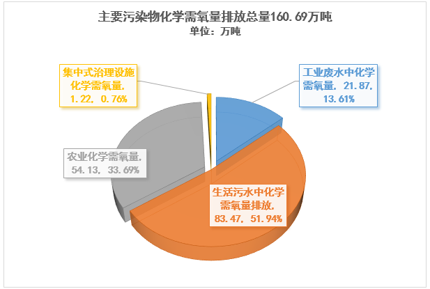 化学需氧量排放量 主要污染物化学需氧量排放总量160.69万吨。其中工业废水中化学需氧量排放21.87万吨,占化学需氧量排放总量的13.61%;生活污水中化学需氧量排放83.47万吨,占51.94%;农业化学需氧量排放54.13万吨,占33.69%;集中式治理设施化学需氧量排放1.22万吨,占0.76%。