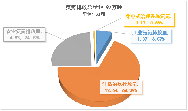 氨氮排放量 氨氮排放总量19.97万吨。其中工业氨氮排放量1.37万吨,占全省氨氮排放总量的6.87%;生活氨氮排放量13.64万吨,占全省氨氮排放总量的68.29%;农业氨氮排放量4.83万吨,占全省氨氮排放总量的24.19%;集中式治理设施氨氮排放总量0.13万吨,占全省氨氮排放总量的0.65%。