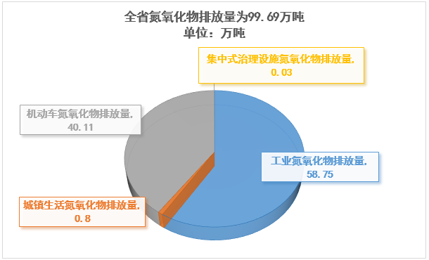 氮氧化物 全省氮氧化物排放量为99.69万吨,其中工业氮氧化物排放量58.75万吨,占全省氮氧化物排放量的58.93%;城镇生活氮氧化物排放量0.80万吨,占全省氮氧化物排放量的0.80%;机动车氮氧化物排放量为40.11万吨,占全省氮氧化物排放量的40.23 %;集中式治理设施氮氧化物排放量0.03万吨,占全省氮氧化物排放量的0.03%。