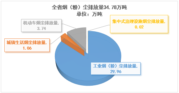 烟(粉)尘 全省烟(粉)尘排放量34.78万吨,其中,工业烟(粉)尘排放量29.96万吨,占全省烟(粉)尘排放总量的86.14%;城镇生活烟尘排放量1.06万吨,占全省烟(粉)尘排放总量的3.04%,机动车烟尘排放量3.74万吨,占全省烟(粉)尘排放总量的10.76%,集中式治理设施烟尘排放量0.02万吨,占全省烟(粉)尘排放总量的0.06%。