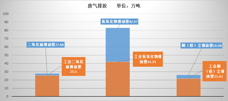 全省工业废气排放量41267.54亿立方米。二氧化硫排放量为27.68万吨,其中工业二氧化硫排放量25.50万吨。氮氧化物排放量为82.97万吨,其中工业氮氧化物排放量41.91万吨。烟(粉)尘排放量26.08万吨,其中工业烟(粉)尘排放量21.63万吨。