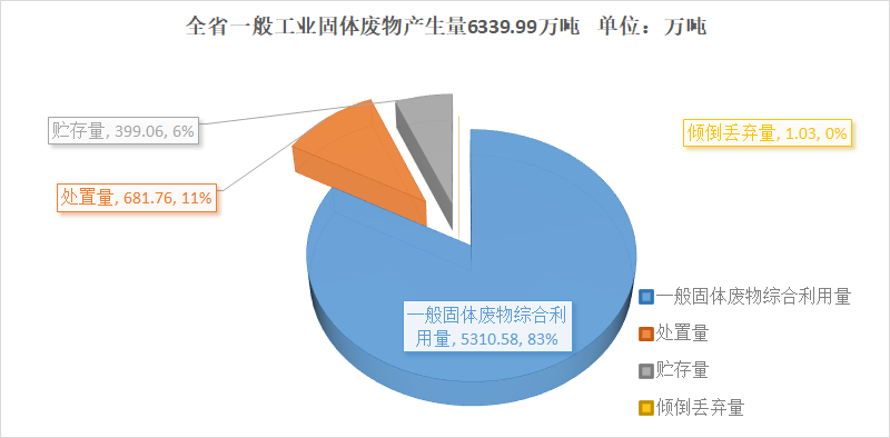 全省一般工业固体废物产生量6339.99万吨,一般固体废物综合利用量5310.58万吨,处置量681.76万吨,贮存量399.06万吨,倾倒丢弃量1.03万吨。