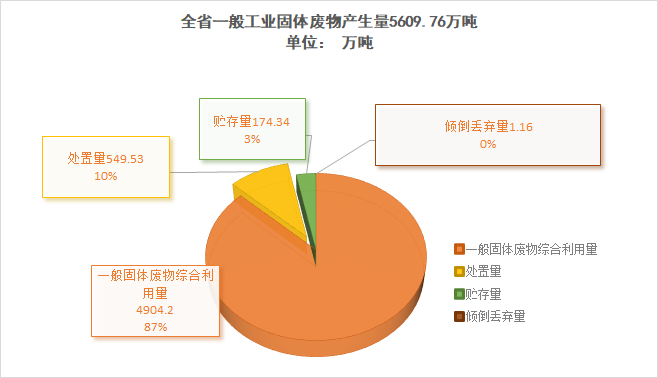 全省一般工业固体废物产生量5609.76万吨,一般固体废物综合利用量4904.20万吨,处置量549.53万吨,贮存量174.34万吨,倾倒丢弃量1.16万吨。