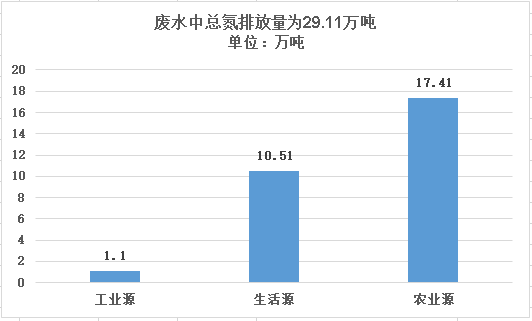 废水中总氮排放量为29.11万吨。其中,工业源、生活源、农业源分别为1.10、10.51、17.41万吨。