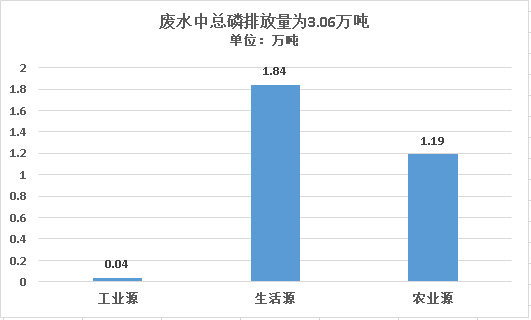 废水中总磷排放量为3.06万吨。其中,工业源、生活源、农业源分别为0.04、1.84、1.19万吨。