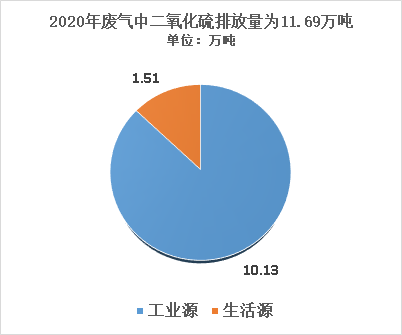 2020年,废气中二氧化硫排放量为11.69万吨。其中,工业源、生活源分别为10.13、1.51万吨。