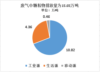 废气中颗粒物排放量为15.65万吨,其中,工业源、生活源、移动源分别为10.82、4.36、0.46万吨。