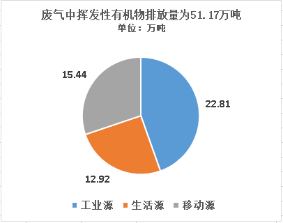 废气中挥发性有机物排放量为51.17万吨,其中,工业源、生活源、移动源分别为22.81、12.92、15.44 万吨。