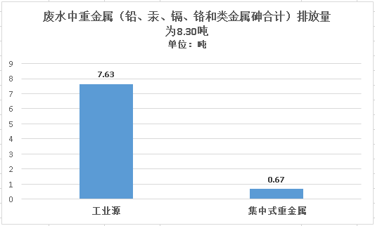 废水中重金属(铅、汞、镉、铬和类金属砷合计,下同)排放量为8.30吨。其中,工业源、集中式重金属分别为7.63、0.67吨。