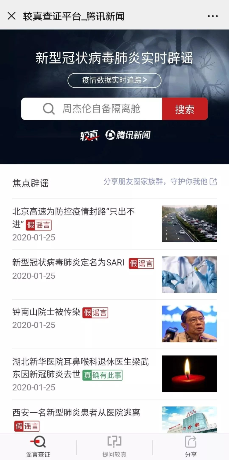 腾讯新闻发布新型冠状病毒实时辟谣及疫情数据实时追踪平台。