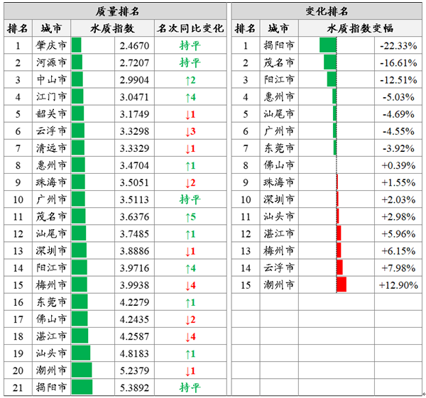 城市排名:基于149个国控断面水质监测结果,按照城市水质指数由低到高排名,全省水环境质量前三名为肇庆、河源和中山市,后三名由高到低为揭阳、潮州和汕头市。揭阳、茂名、阳江等7市水环境质量同比有所改善,潮州、云浮、梅州等8市同比有所下降(韶关、河源、中山、江门、肇庆、清远市所有国控断面均达到水质目标且均达到或优于Ⅱ类,不参与水质变化排名)。