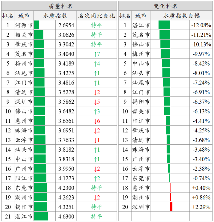 城市排名:基于270个省考断面水质监测结果,按照城市水质指数由低到高排名,全省水环境质量前三名为河源、韶关和肇庆市,后三名由高到低为湛江、揭阳和潮州市。湛江、茂名和佛山等17市水环境质量同比有所改善,深圳、潮州和惠州3市同比有所下降(河源市所有省考断面均达到水质目标且均达到或优于Ⅱ类,不参与水质变化排名)。