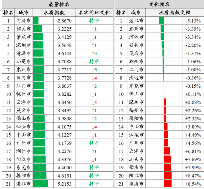 城市排名:基于270个省考断面水质监测结果,按照城市水质指数由低到高排名,全省水环境质量前三名为河源、韶关和肇庆市,后三名由高到低为湛江、揭阳和东莞市。湛江、惠州和河源等9市水环境质量同比有所改善,珠海、阳江和肇庆等12市同比有所下降。