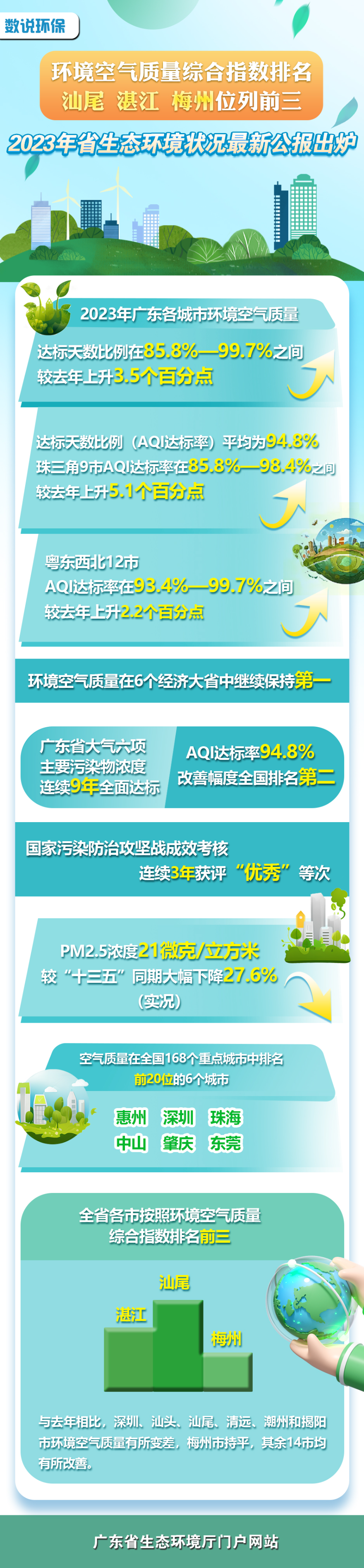 2023年省生态环境状况最新公报出炉 环境空气质量综合指数排名汕尾、湛江和梅州位列前三