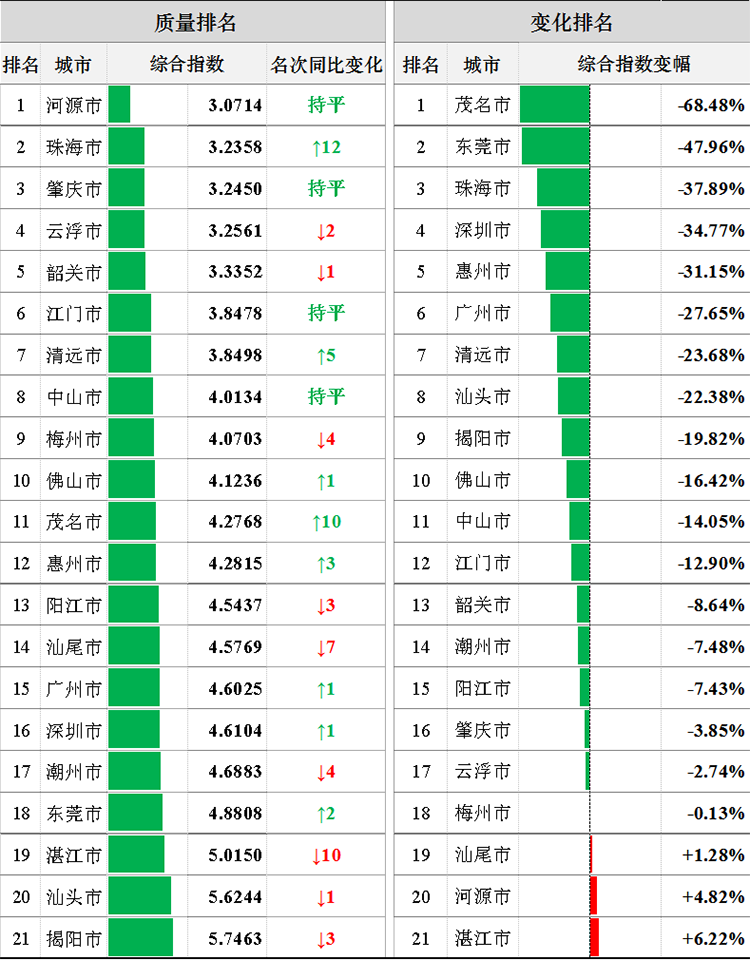 2020年1-3月,187个省考断面(包括168个地表水考核断面和19个入海河流国考断面)中,水质综合指数排名前三位为河源、珠海、肇庆市,后三位为揭阳、汕头、湛江市。茂名、东莞、珠海等18市水环境质量同比有所改善,湛江、河源、汕尾等3市同比有所变差。