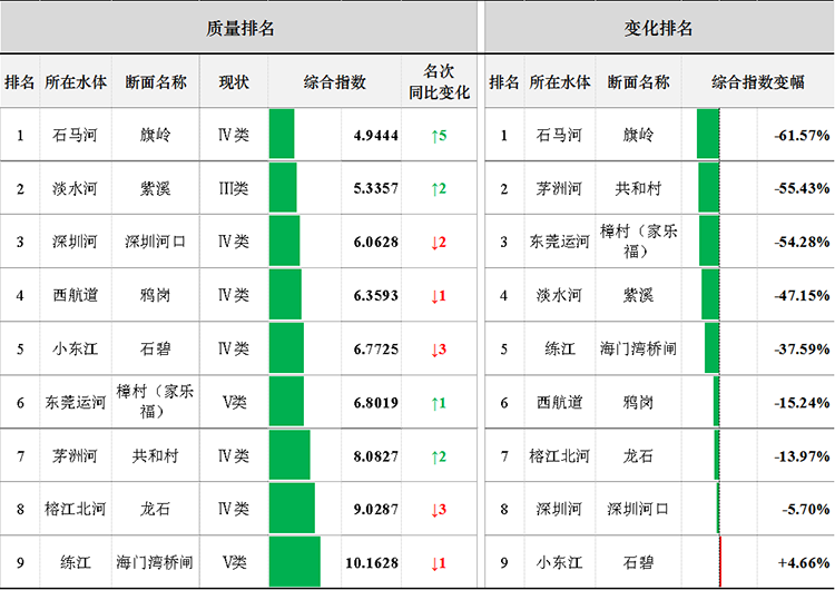 2020年1-3月,9个全面攻坚劣Ⅴ类国考断面中,水质综合指数排名前三位为石马河旗岭、淡水河紫溪、深圳河河口,后三位为练江海门湾桥闸、榕江北河龙石、茅洲河共和村。石马河旗岭、茅洲河共和村、东莞运河樟村(家乐福)等8个断面水质同比有所改善,小东江石碧1个断面同比有所变差。