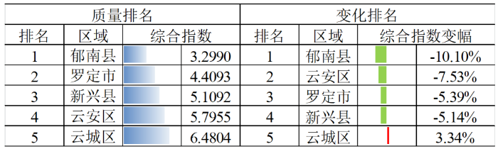 2020年1~7月,云浮市12个地表水省考、市考断面水质优良率(Ⅰ~Ⅲ类)为75.0%,劣Ⅴ类断面比例为16.7%。按照地表水省考、市考断面综合指数排名,按先后顺序分别为郁南县、罗定市、新兴县、云安区、云城区,与2019年同期相比,郁南县、云安区、罗定市、新兴县的水环境质量均有所改善,云城区的水环境质量有所下降。