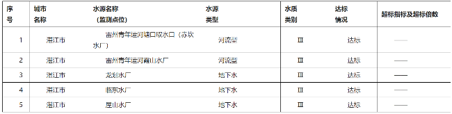 向湛江市市区供水的5个饮用水源,水质全部达标。