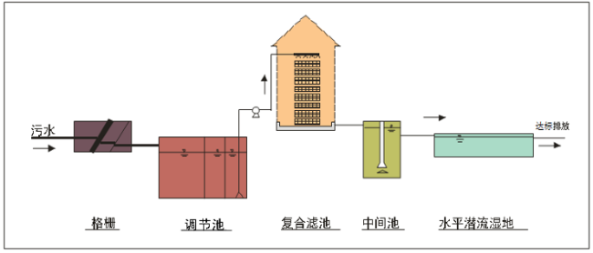 组合式复合滤池+高负荷人工湿地工艺流程图