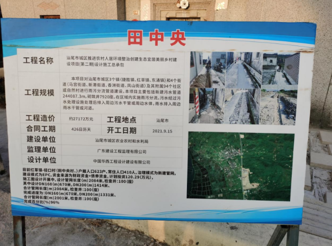 治理工程由汕尾市城区财政统筹资金支持实施建设,计划建设周期为2年。治理工程计划于2022年底完工后移交给所在的村(社区)负责日常管护。该管网基本覆盖汕尾市城区7个镇(街道)未实现雨污分流的94个自然村,配套建设污水收集管网长度约244公里,黑水和灰水应接尽接。治理工程总投资约2.89亿元。其中,部分村庄纳入2021年省民生实事办理范畴,大力推进相关管网改造工作,在实施过程涌现出一批好的经验做法。