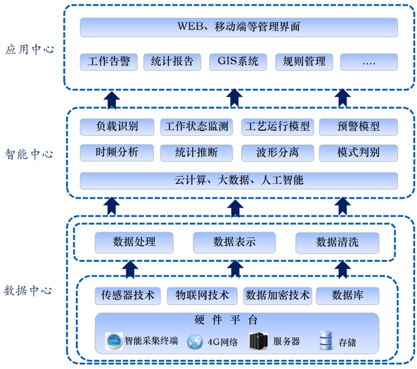 本系统通过对分散式农村污水处理站的用电信息进行感知、测量、采集,通过云计算、大数据和人工智能对采集的数据进行分析处理,可以准确地监控污水处理站的设备运行状态,能够精确判断污水处理站的工作时间,分析主要设备的工作状态,结合相应的处理工艺工作要求,判断污水处理站工作运行状态,对不能够正常工作的污水处理站进行分类报警,督促运维部门及时维修。本系统为管理部门实时掌握辖区的分散式农村污水处理站的运行状态提供一个有效的监管手段。