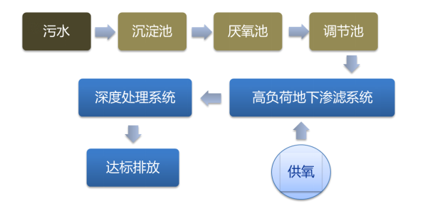污水首先经过格栅去除塑料袋、树叶、砂石等颗粒物质后进入沉沉池,比重较大的颗粒沉淀后进入厌氧池,在厌氧菌的作用下将大分子有机物转化分解为小分子有机物,同时污水中的颗粒物进一步降低,最后通过提升泵间歇性将污水泵入高负荷地下渗滤系统。
